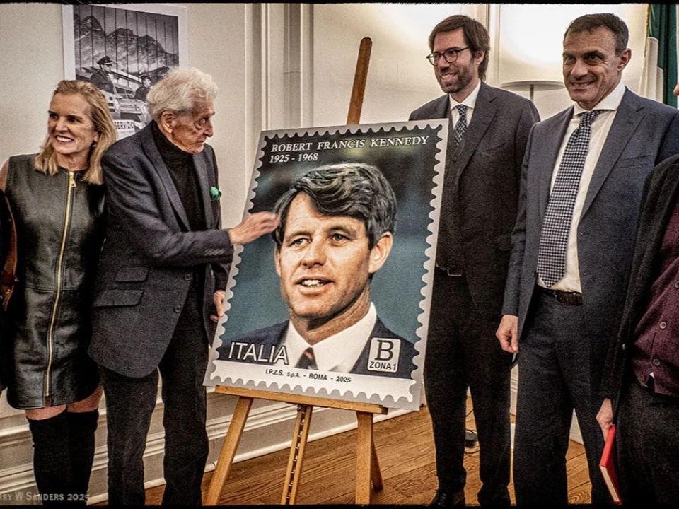 The gathering, held at the Consulate on Park Avenue, marked the presentation of a commemorative stamp dedicated to Robert F. Kennedy, issued on the centenary of his birth by Italy’s Ministry of Enterprise and Made in Italy in collaboration with Poste Italiane.