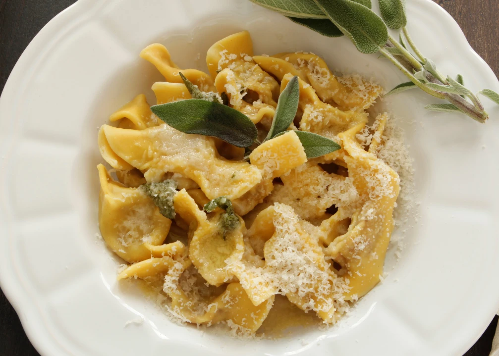 6. Cook the casoncelli in the boiling water for about 10 minutes. Drain with a slotted spoon and transfer to the pan with the butter and sage sauce. Toss gently for a few seconds, until evenly dressed. Serve immediately with a dusting of grated Parmesan cheese.