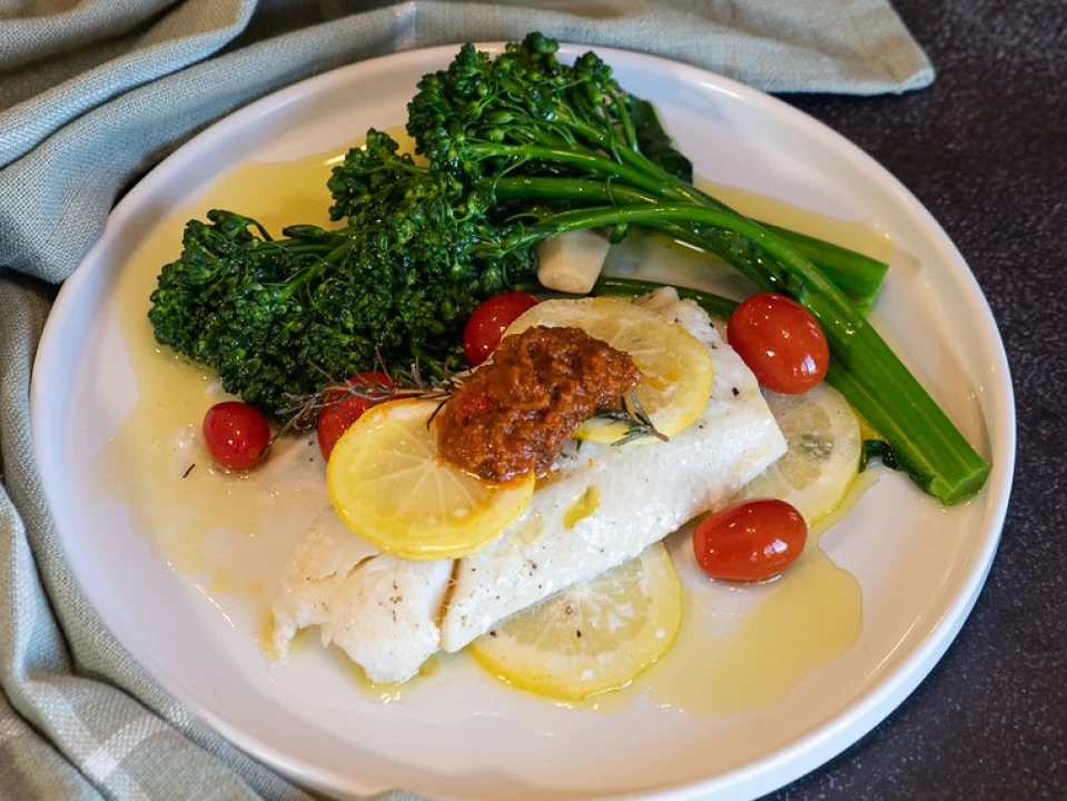 - To serve fish, use a spatula to lift it out of the oil. Place on a plate and serve with the broccolini next to it. Slather 1 Tablespoon Sundried Red Pesto over each fish fillet and drizzle a few tablespoons of the leftover oil from poaching over the broccolini.