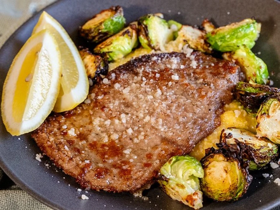 When the seasons change from fall to winter I tend to crave creamy polenta, crispy, olive-oil laden vegetables, and, on occasion, the rich and succulent flavors of veal. For this reason, I’ve created a dish that combines all three. My Milanese-Style Veal Scallopine with Creamy Polenta and Brussels Sprouts recipe is easy enough to serve anytime, yet worthy of a special occasion. Not a fan of veal? You can swap it out for roasted butternut squash, eggplant, chicken, beef, or fish fillets as well!