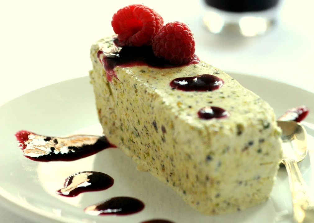 I love it with pistachios from Bronte, a small village in Sicily, considered the capital of Italy for this delicious nut. Pistachios from Bronte are very tasty and have a beautiful emerald green color. The addition of raspberry sauce with its contrasting hue makes this dessert irresistible.