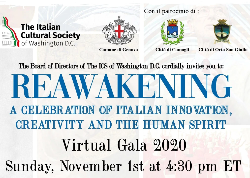 The Italian Cultural Society of Washington D.C. Announces: ICS VIRTUAL GALA 2020 “Reawakening—A Celebration of Italian Innovation, Creativity and the Human Spirit.” Sunday, November 1st at 4:30pm ET, on the ICS webpage.