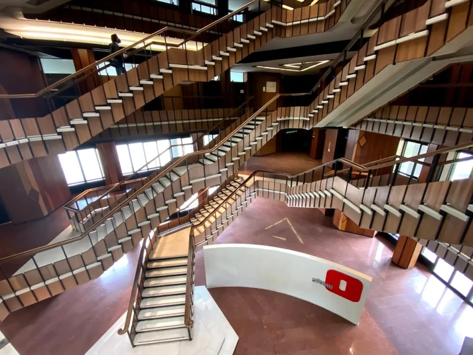 The floor plan of the building is organized in three bodies, inclined 120 degrees to each other, and of spans varying between 16 and 20 meters, connected by a central element. The central body is the centerpiece of the building and houses a large monumental staircase, a true masterpiece of Design, on par with many office buildings built in those years for large industrial groups. The ground floor houses in wing C, to the northeast of the building, a large space intended for the presentation of Olivetti products; at the far end, a large room for company meetings; and in wing A, to the southwest, the guest quarters, designed by Ettore Sottsass Jr.