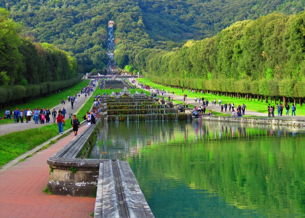 At the center of the rear façade of the palace, the central main boulevard starts with a series of fountains, pools, waterfalls and the famous Great Waterfall which, starting from the northern edge of the Italian Garden, connects to the English Garden. The latter was built in 1785 by Sir John Andrew Graefer at the behest of Queen Maria Carolina of Austria, impressed by the trend of the moment in vogue in Europe of the English style gardens designed by William Kent.