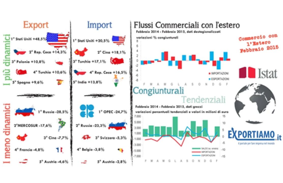 ISTAT data on Foreign Trade in February 2015, give a photo of a cyclical increase in imports and exports with a trade surplus of 3.5 billion euro, increasing if compared to February 2014 (2.4 billion euro). Italian exports gave a positive performance (+ 2.5%) due to the increase in sales both in the EU (+ 0.8%) than outside the EU (+ 4.8%). As for the economic sectors, growth is driven by capital goods (+7.6), the durable consumer goods (+3.9) and energy products (+ 2.7%).
