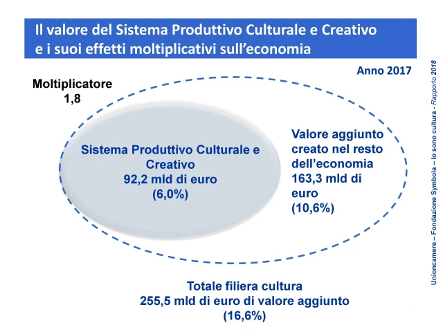 The Cultural and Creative Production System (the report defines the cultural and creative supply chains as a whole) in 2017 accounted for 6% of the wealth produced in Italy: over €92 billion. This is an increase of 2.0% compared with the previous year.