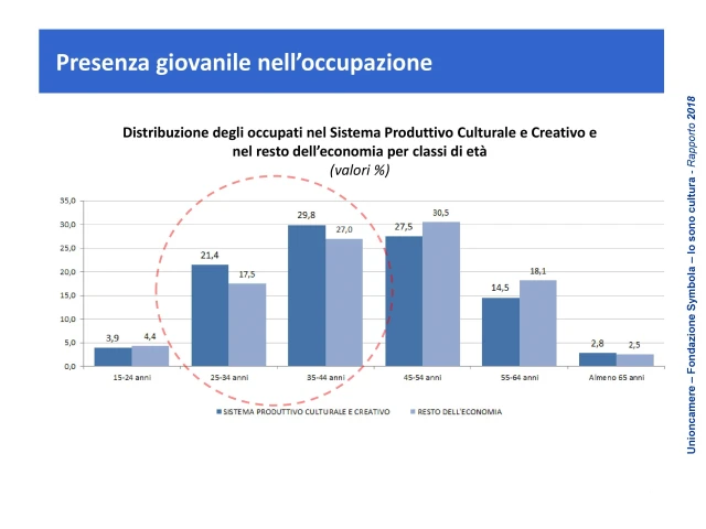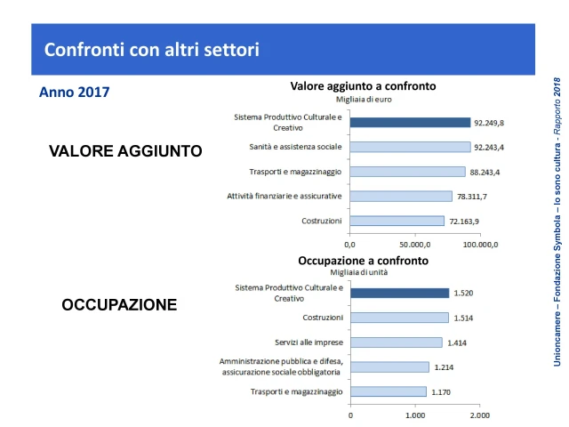 The Cultural and Creative Production System (alone, without considering the other segments of our economy) employs more than 1.5 million people, 6.1% of the total number of people employed in Italy. This is also an area of growth: +1.6%, this time with a result higher than that of the economy as a whole (+1.1%).