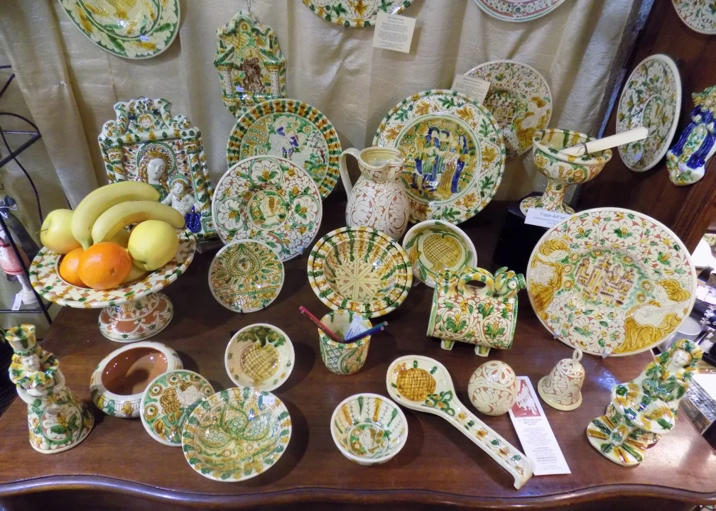 The forms were simple at first, including plates, bowls, dishes and tankards, although more complex objects such as cups and inkwells began to appear later, often decorated with contoured figurines of people and animals.