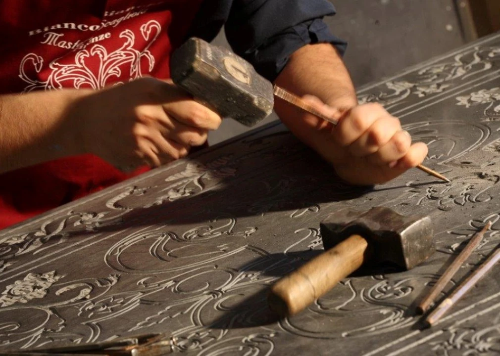 Once it has been brought back it will be engraved with the use of pointed irons used to make the incision. For small details or single colour touches, the scagliola can be stuck on in a more liquid state. In other cases, it is preferable to make it more solid or more doughy. The shades and chiaroscuro may be obtained through touches with brush tips that were in use in the nineteenth century.