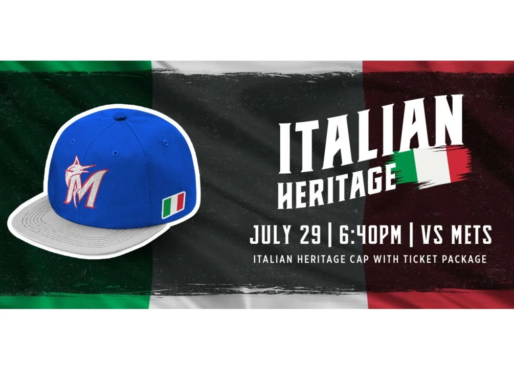 Join us for our Italian Heritage Celebration at loanDepot park on Friday, July 29 at 6:40PM. Make some noise and represent as the Marlins take on the Mets. Purchase an Italian Heritage ticket package that includes a commemorative Italian Heritage Celebration Marlins cap. Buy Tickets here. A portion of the proceeds from each ticket will benefit the Italian American Baseball Foundation (IABF).