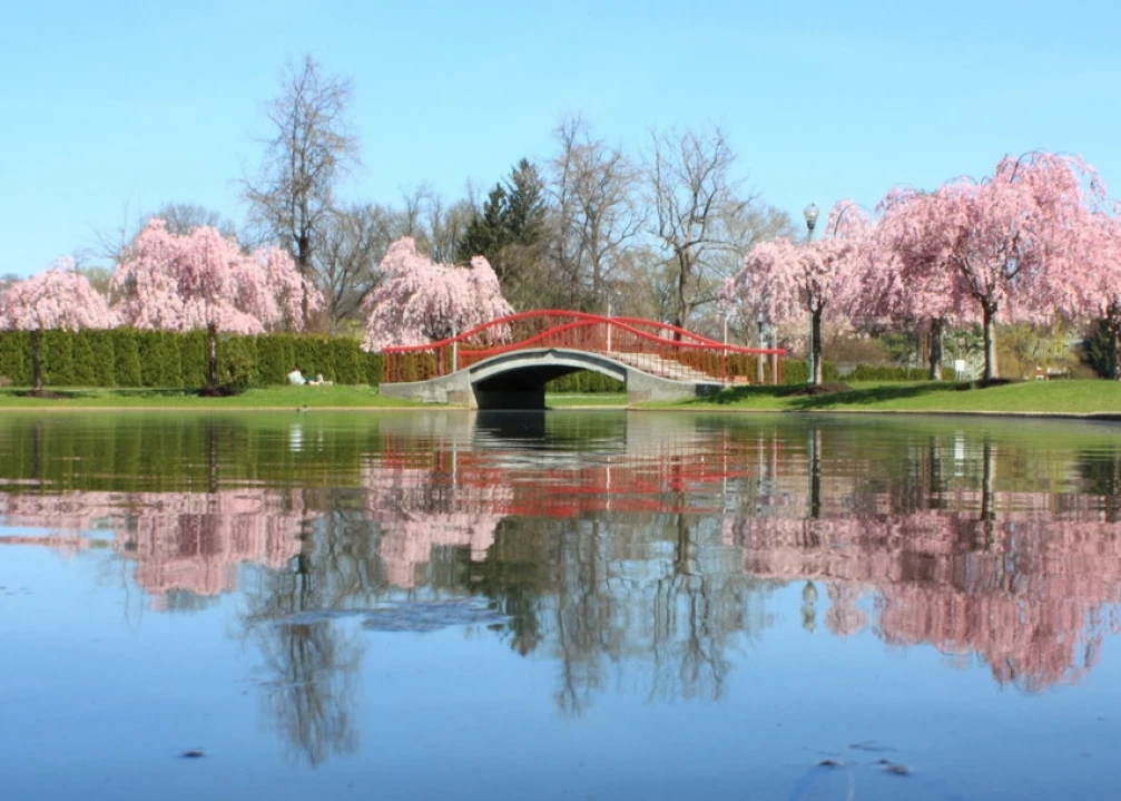 Italian Lake Park at Third and Division streets was part of the City Beautiful Movement in 1901. It was designed by landscape architect Walter Manning of Boston. Features of the Lake include a Japanese harmony bridge and the Dance of Eternal Spring sculpture. After the lake had fallen into disrepair, in 1990 the city spent $200,000 to make repairs and improvements. The lake was drained and dredged to remove debris from hidden mosaic tile, the fountain was repaired and the concrete barrier was rebuilt.