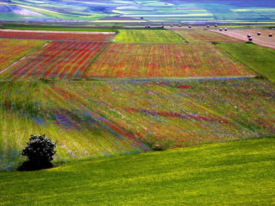 Thinking of the Sibillini Mountains National Park, it is inevitable to mention Castelluccio di Norcia, one of the highest population centers in the Apennines. Here, the famous Castelluccio bloom lights up the basin, located at an elevation of 1452 m, with red, yellow, purple, blue and green. The peaks of the Apennines rise further to the highest, dominating the region, belonging to Mount Carrier (2,476 m).