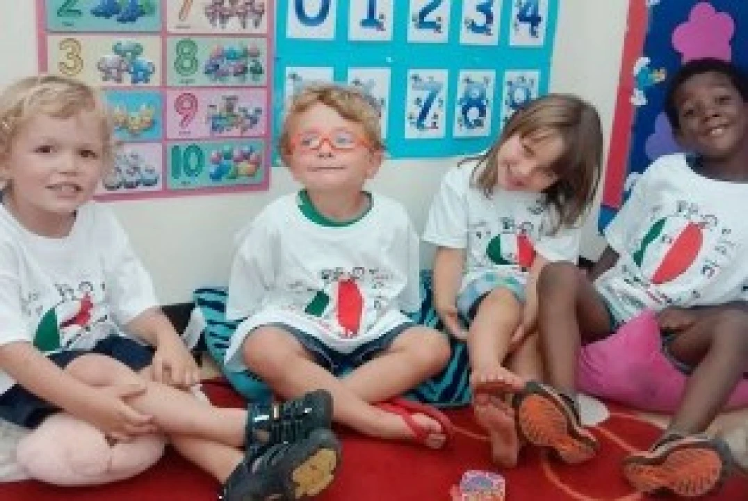 Parents and preschoolers open the door and are instantly inside an Italian classroom; Italian children's music is playing softly in the background, papers with finger-paint handprints hang on the walls, and colorful posters for the days of the week and number charts hang in a corner filled with throw pillows. There are toys everywhere and books in Italian fill several shelves.