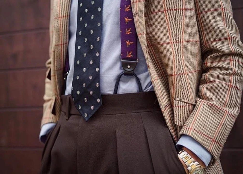 Other great winter companions are a single-breasted jacket with patch pockets in burnt tones of Donegal tweed, a single-breasted jacket with welt pockets in herringbone Harris tweed, a single-breasted jacket in Scottish tweed with authentic district checks. The style can be inspired by a wide range of examples and should be chosen with appropriate attention. Options range from the hacking jacket, a simple equestrian garment characterized by a central vent, slanted welt pockets, and a pocket flap closure, to the monumental Norfolk jacket with large applied pockets at the bottom, chest hand-warmer pockets, sewn-in shoulder straps, and a distinctive belt added to the four front buttons. Although these jackets, except for the hacking jacket, can also be worn as part of a suit, it is generally preferred to let them stand alone and pair them with dark carded flannel trousers.