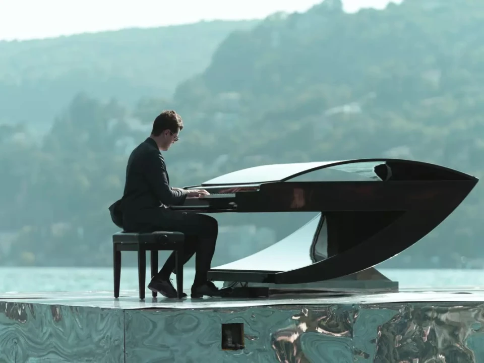 Pictures from the first concert look like something out of a sweeping romantic epic— with Martire sitting before his custom-crafted, almost futuristic Waves piano, designed by Italian architect Claudio Bargna from the town of Cantù, known for its artisanal furniture. More than 5,000 people watched from the shore in 2020. During subsequent performances, spectators took in the music from boats and rafts on the water.