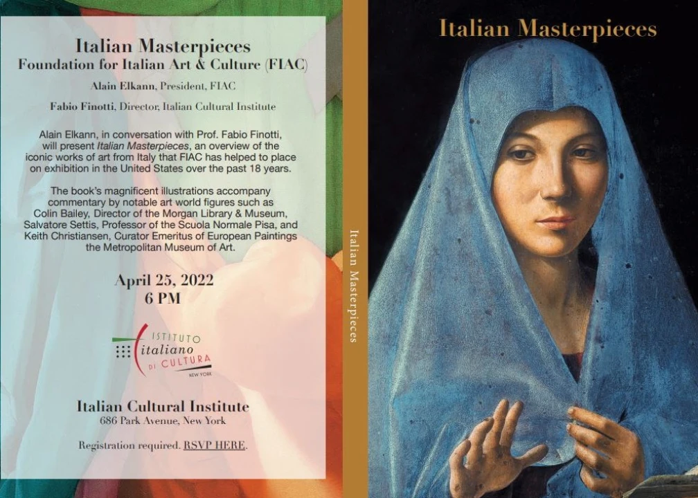 Monday, April 25 2022 | 6PM. Italian Cultural Institute, 686 Park Avenue, NY. Please, RSVP HERE. Italian Masterpieces. Foundation for Italian Art & Culture (FIAC). Alain Elkann, President, FIAC in conversation with Fabio Finotti, Director, IIC New York. Free entrance. Guests will be asked proof of vaccination and ID upon entry. The event will be streamed live on IIC YouTube channel and will remain available.