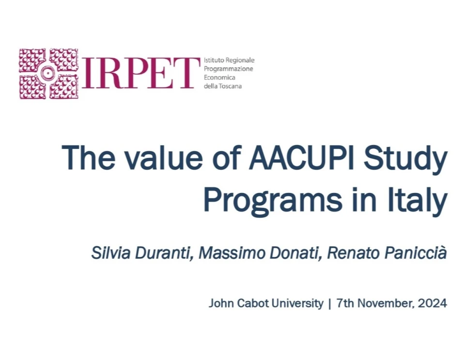 The report "The value of AACUPI Study Programs in Italy" (by S. Duranti, M. Donati, and R. Paniccià, bilingual publication) was presented by AACUPI – Association of American College and University Programs in Italy last November at the John Cabot University in Rome.