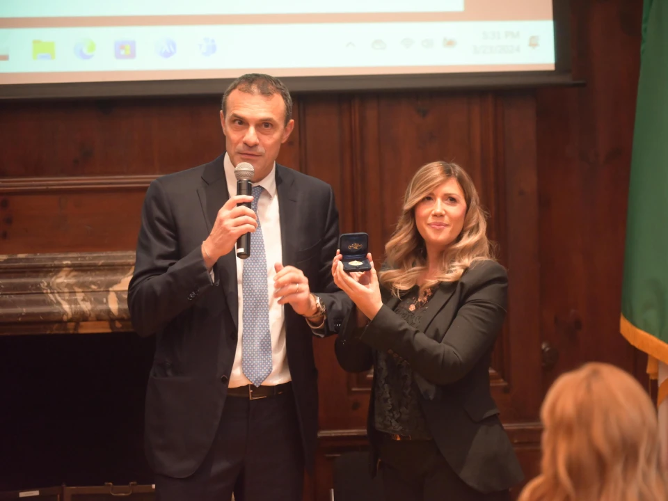After reading Tripodi's message, Director Finotti handed over to the Consul General of Italy in New York, Fabrizio Di Michele, who emphasized the importance of this initiative and expressed his joy at seeing such a concentration of Italian talent from diverse backgrounds in New York, as the city is a global hub of excellence. The Consul General Di Michele was the first to present the award, which consists of a coin engraved with the goddess of reputation crafted by master artisan Marco de Luca, to a colleague, the Consul General of Italy in Detroit, Allegra Baistrocchi, hailed by Di Michele as an Italian diplomatic excellence and a role model for this significant and delicate role.