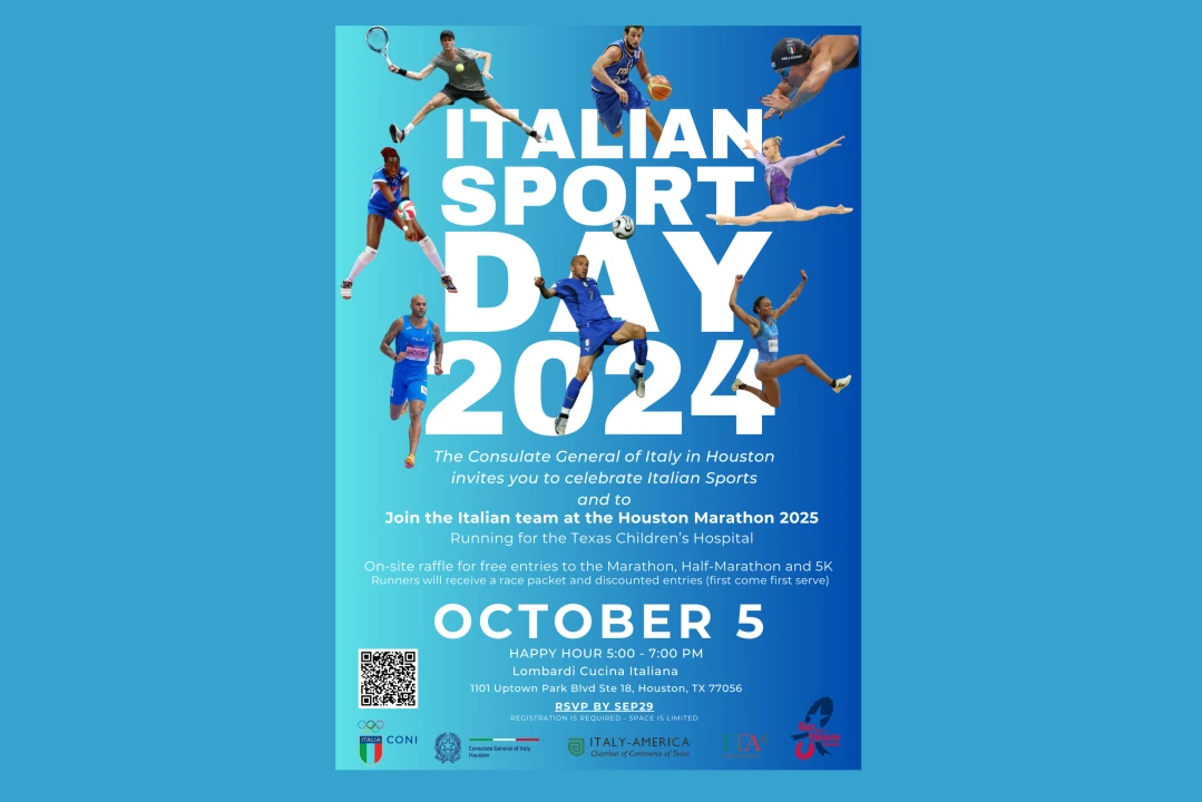 The Consulate General of Italy in Houston invites you to celebrate Italian Sport Day and to join the Italian team at the Houston Marathon 2025, running in support of the Texas Children’s Hospital.
