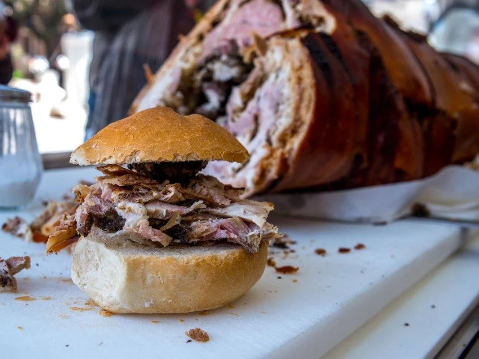 To fully enjoy a porchetta sandwich, it should be served warm. The heat softens the meat, enhancing its flavor, while the crispy skin adds a satisfying crunch. While the classic sandwich is delicious on its own, many enjoy adding local ingredients such as chicory, artichokes, or smoked cheese. Sun-dried tomatoes and green sauce also pair beautifully with porchetta, adding an extra layer of flavor.
