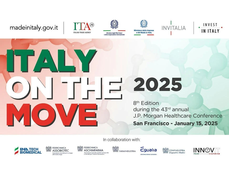 To promote investment opportunities in Italy in 2025, the Italian Trade Agency (ITA) and the Ministry of Foreign Affairs will be hosting the eighth edition of "Italy on the Move," a side event of the 43rd annual J.P. Morgan Healthcare Conference 2025.