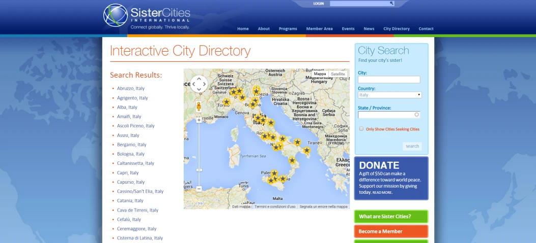 No, non credo che ci sia una particolare regione predominante. Sono presenti città dal nord come dal sud Italia. Ci sono però importanti città italiane che ancora non hanno partnership con città americane, e saremmo molto interessati a organizzare gemellaggi con loro: Napoli, Bari, Messina, Trieste, Taranto, Brescia, Reggio Calabria, Ravenna, Foggia, Cagliari, Sassari, Siracusa, Trento, Piacenza, Ancona, Arezzo, Udine, Bolzano.