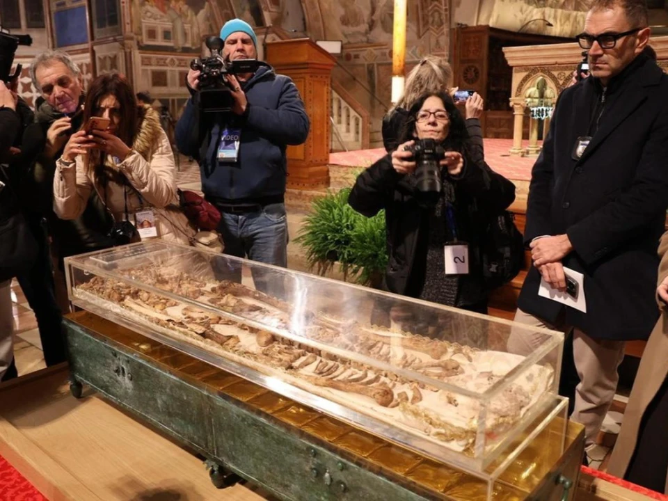 The patron saint of Italy's remains have been resting in a stone sarcophagus for centuries. On Saturday, the coffin was ceremoniously transferred from the crypt to the lower church of the Basilica of St Francis of Assisi. The display will last one month and end on March 22. According to the Franciscan Order, nearly 400,000 people from across the globe have registered to attend.