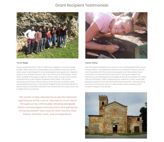 Promuovere la conoscenza e l'apprezzamento della cultura italiana nella nostra comunità è il cuore della missione della Vermont Italian Cultural Association. Ogni anno VICA assegna piccole sovvenzioni e borse di studio per sostenere progetti e iniziative coerenti con la nostra mission. Il VICA Scholarship and Grants Fund incoraggia a fare domanda coloro che cercano di ampliare la loro conoscenza dell'Italia, inclusa l'esperienza italoamericana e quella italiana, la sua lingua, le arti, la musica, la storia e la cultura. Recentemente (prima del covid) sono state assegnate due borse di studio. Una è andata a uno studente dell'Università del Vermont che ha partecipato a un progetto di ricerca archeologica e agronomica in un'antica villa romana nel comune di Mompeo nel Lazio. L'altro beneficiario, anche lui studente dell'UVM, ha frequentato una scuola di archeologia sul campo a Badia Pozzeveri in Toscana, dove ha partecipato allo scavo dei resti di una chiesa del XIII secolo. Alla conclusione di ogni progetto, i borsisti hanno fatto delle presentazioni ai membri della VICA e alla comunità in generale.