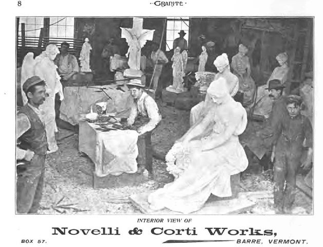 Altri immigrati italiani vennero dal nord come uomini d'affari o proprietari terrieri. Altri dal sud Italia lavorarono prima per le ferrovie americane e poi emigrarono a Barre stabilendo una varietà di imprese. La Novelli & Corti fu fondata da Samuel ("Sandro") Novelli ed Elia Corti nel 1901 e comprendeva anche John ("Crosta") Comi e William ("Bigin") Corti. Novelli & Corti divenne il primo studio di scultura e intaglio di Barre all'inizio del 1900. Ci sono molti esempi eccezionali dell'abilità degli scultori di Barre nei monumenti in tutta la città. E una passeggiata attraverso il cimitero di Hope, dove molti scalpellini italiani immigrati sono sepolti, è una testimonianza delle loro abilità.