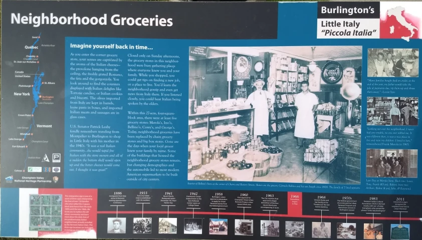 Gli immigrati italiani si stabilirono anche nel centro urbano di Burlington in gran numero, come operai che lavoravano sulle ferrovie e altri nei depositi di legname. Alcuni divennero venditori ambulanti di frutta e verdura, e più tardi aprirono mercati per servire la crescente popolazione italiana. Per gli italiani di questo quartiere di Burlington - nonostante le difficoltà della grande depressione - gli anni precedenti la Seconda Guerra Mondiale furono una specie di "età dell'oro" sociale e culturale. Le loro attività commerciali popolavano il quartiere. Per i generi alimentari in generale, ma in particolare per la pasta, il salame e le olive, i vicini facevano la spesa da Colaceci, Izzo e Merola. Per una serata fuori la gente cenava al Bernardini's Café, e a partire dal 1941 e per i successivi 70 anni Bove's era il ristorante dove offrire alla famiglia e agli amici una cena italiana a buon mercato.