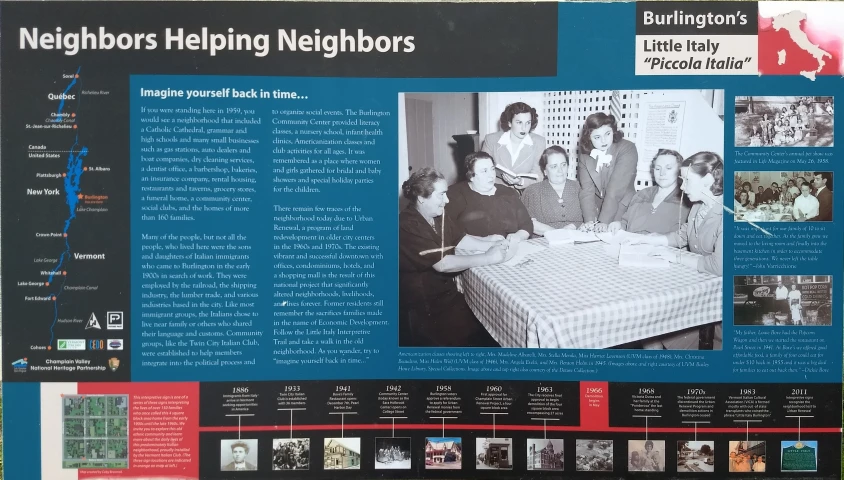 Il quartiere era anche sede di istituzioni italiane. Nel 1933 gli uomini italiani di Burlington si unirono ai loro connazionali di Winooski per formare il Twin City Italian Club (TWIC). Il suo scopo dichiarato era quello di "elevare gli standard" della comunità italiana e di preparare gli immigrati alla cittadinanza, ma era anche un luogo dove gli uomini italiani del vecchio continente potevano socializzare, parlare delle notizie da casa e forse fare affari. Nel 1936 il club era sufficientemente prospero da comprare un lotto libero e costruire una sede. La sede fu il centro della vita sociale italiana nella contea di Chittenden per la dozzina di anni successivi. Le donne italiane socializzavano in un'organizzazione chiamata Regina del Monte Carmelo, un gruppo che assisteva alla messa insieme una volta al mese. La Regina del Monte Carmelo era Maria, che per secoli ha avuto un seguito devoto nel sud impoverito d'Italia da dove tanti italiani erano emigrati.