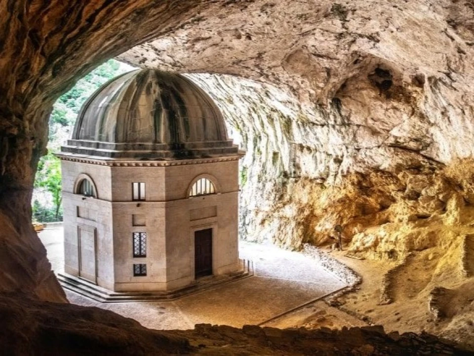 Built in 1828 at the request of Pope Leo XII, a native of Genga, this octagonal sanctuary of white travertine crowned with a lead dome stands beside the ancient Hermitage of Santa Maria infra Saxa, at the heart of a landscape that blends untamed nature, sacred history, and spiritual atmosphere. It is considered a one-of-a-kind place, uniting architecture, spirituality, and landscape in an experience that truly takes your breath away.