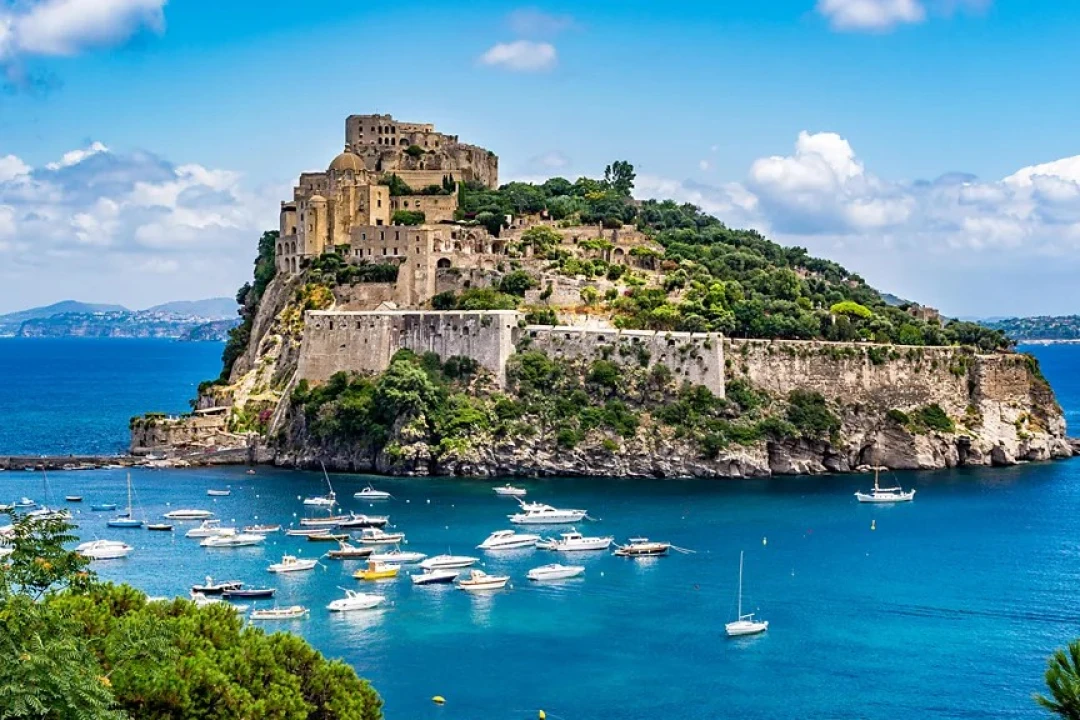 Jagged cliffs shoot up from the waves; sunbathers sprawl on the inlet bridge leading to the 2,500-year-old Aragonese Castle, attached to the island like the tail of a whale periscoping through the waves. After just 10 minutes at sea, we reach a network of buoys marking the ruins below. I press my hands against the vessel's transparent bottom.