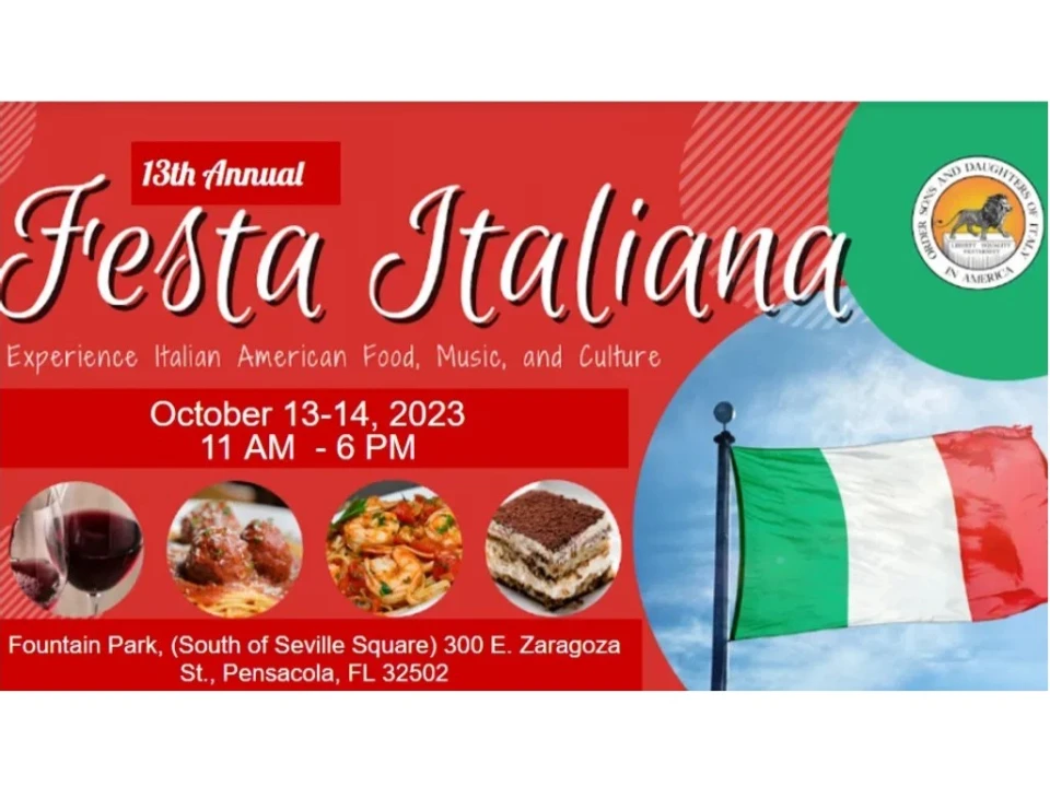 The Sons & Daughters of Italy in America Buona Fortuna Lodge in Pensacola, Florida invites you to our 13th Annual Festa Italiana. Come enjoy our two-day event on Friday, October 13, 2023 and Saturday, October 14, 2023 from 11:00 AM until 6:00 PM. The Festa Italiana will be held at Fountain Park, (South of Seville Square) 300 E. Zaragoza Street in beautiful downtown Pensacola.