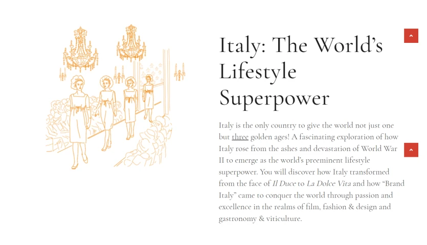 "Italia: The World's Lifestyle Superpower" è una delle mie conferenze preferite per almeno due motivi. Primo, perché è iniziata con la constatazione che l'Italia è l'unica cultura ad aver dato al mondo non solo una ma tre Età dell'Oro. Le prime due età dell'oro sono ovviamente familiari - l'antica Roma e il Rinascimento - ma questa terza età dell'oro è uno stile di vita. Mentre il potere della Roma classica era basato su una forza militare superiore combinata con una superba organizzazione (nella costruzione di infrastrutture e nell'istituzione di un governo), la gloria dell'Italia del secondo dopoguerra si è basata sul potere di attrazione e persuasione: l'Italia moderna ha conquistato il cuore del mondo.