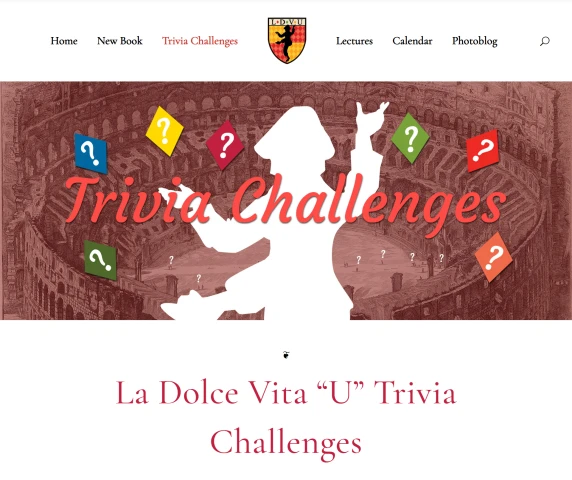 In una sfida di La Dolce Vita "U" trivia, i partecipanti possono "testare" le loro conoscenze e, nel processo, scoprire fatti sorprendenti e poco conosciuti sulla cultura italiana. Le sfide a quiz sono divertenti e coinvolgenti, simili a un gioco televisivo come Jeopardy, e allo stesso tempo sono ricche di informazioni interessanti... tanto che quasi non ci si accorge di quanto si sta imparando. Con una scorta di dozzine di domande intriganti, ho ospitato sfide di Trivia per grandi o intime riunioni, pubblico dal vivo e virtuale, studenti universitari e delle scuole superiori, ristoranti raffinati e negozi, funzioni private e raccolte di fondi.