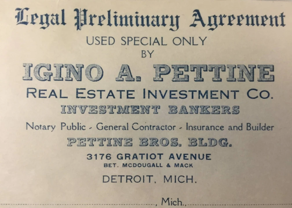 Igino A. Pettine nacque a Pescolanciano, oggi provincia di Isernia, il 4 gennaio del 1888. A soli diciotto anni decise di rincorrere il “sogno americano”. Giunse ad “Ellis Island”, nel 1906, a bordo della “Prinzess Irene”. Di vivace intelligenza e dotato di un notevole spirito di intraprendenza non impiegò molto ad ambientarsi negli Stati Uniti. Giunto a Detroit iniziò da subito a lavorare.