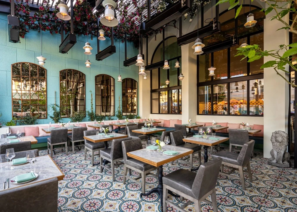 Designed in-house, the 111-seat Marisi emerges in the former Wall Street home of Whisknladle, retaining the enormous front patio that’s now decorated in sunny colors with flowering vines hanging high above its tiled floor. There’s more intimate seating inside the space, which is dominated by a half-moon bar and an open kitchen anchored by a 10-foot hearth where much of the menu is cooked.
