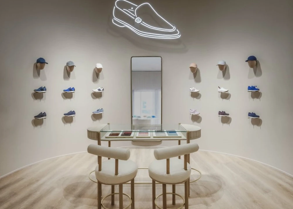 Already present in Los Angeles, in Beverly Hills on Rodeo Drive, in West Hollywood at the Pacific Design Center, and in the luxury mall of South Coast Plaza, Loro Piana is taking advantage of this temporary space to present its collection of shoes and hats; items that are marked in neon on the storefront.