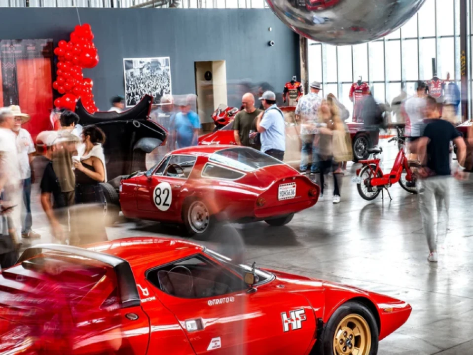 The Red Room pulled people in. A collection of scarlet Ferraris, Alfas, and Lancias lined up together, a reminder of how deeply the color red runs through Italian performance. It was simple exposition, the cars laid out in a cavernous warehouse space, but a powerful one. In the middle hung giant chrome balls that caught the light and threw reflections across the cars, adding a surrealism element to the display