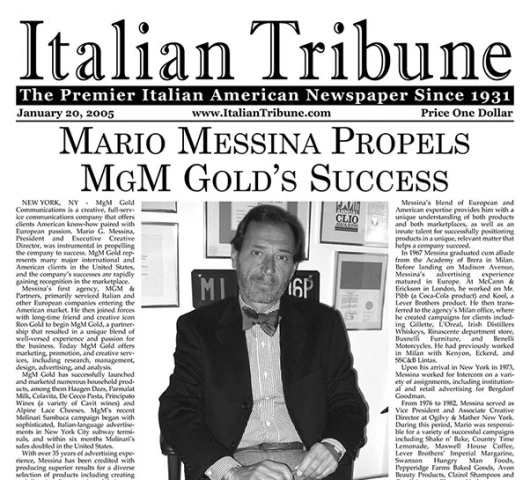 L'ospite di questa intervista è uno dei protagonisti di quell'epoca e dell'evoluzione della pubblicità fino ai giorni nostri. Mario Messina è un italiano fiero delle sue origini che da decenni ormai è leader nella promozione di tanti prodotti: ma è anche colui che per primo aprì una agenzia a New York esclusivamente dedicata a promuovere l'Italia, un pioniere che aprì la strada a stelle e strisce quando i prodotti italiani erano ancora poco promossi e conosciuti in America. Siamo grati a Mario per la sua cortesia e per la sua disponibilità