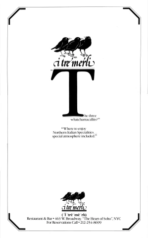 Penso che una delle cose più divertenti, probabilmente, sia stata il mio coinvolgimento con un ristorante italiano negli Stati Uniti chiamato "I Tre Merli". Due ragazzi italiani vennero a New York da Genova, cercando di fare qualcosa: avevano un ristorante a Genova e volevano aprire un ristorante italiano a New York. Così aprirono a SoHo, ma allora nessuno cercava cibo italiano a SoHo. Inoltre, non c'era un'ampia conoscenza del cibo regionale italiano: il cibo di Genova era sconosciuto, quello di Reggio Emilia era sconosciuto, quello del Friuli Venezia Giulia era sconosciuto, e così via. All'epoca c'era solo “cibo italiano” a New York e negli Stati Uniti.