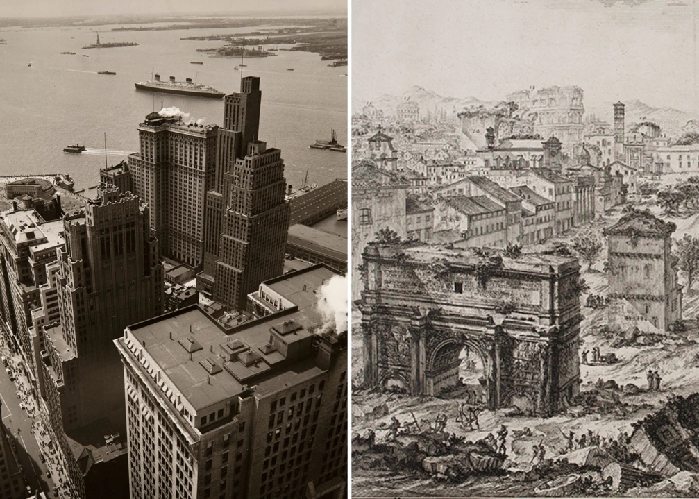 Berenice Abbott photographed New York in the 1930s while Piranesi created a large number of etchings of Rome as it was in mid-1700. Through the mastery of their art and their ability of seeing these two metropolises with foreign eyes, since Abbott grew in Ohio and Piranesi was born and raised in Venice, these two artists helped create the myth of the two cities, a myth that lasts to this day.