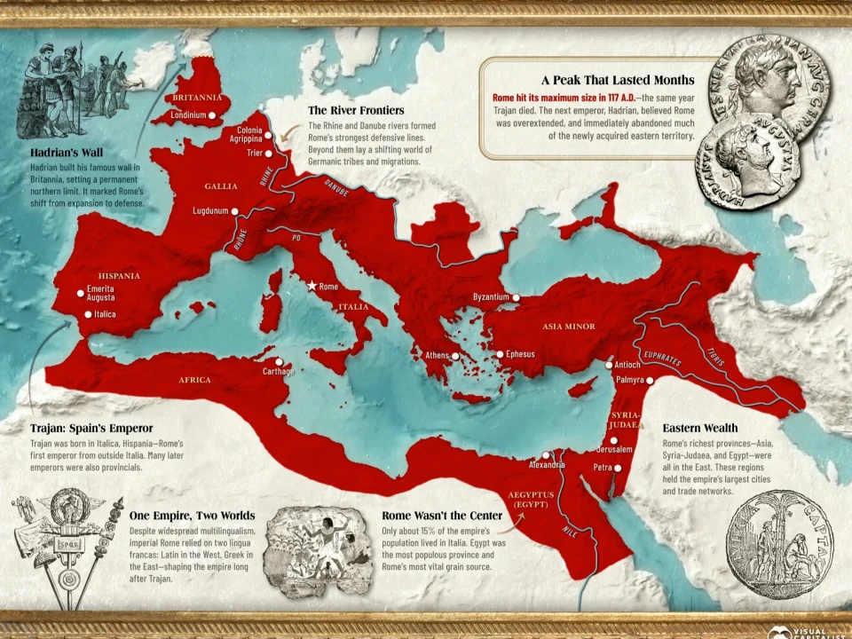 For any fan of history or of Ancient Rome, our infographic map of the Roman Empire probably looks familiar. It shows the maximum territorial extent ever achieved by the Roman Empire, just after Trajan’s ambitious wars in the East, during which he captured Dacia (Romania), Armenia, Mesopotamia, Assyria, and the Parthian capital of Ctesiphon (in modern-day Iraq).