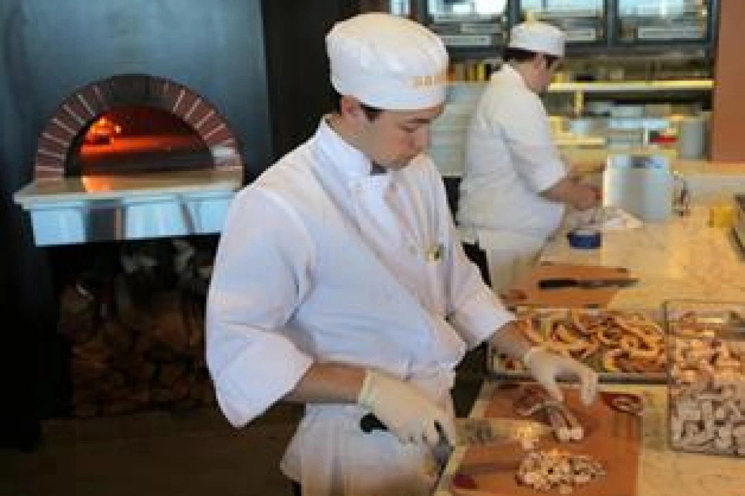 "Soon" turned out to be 2½ years. On Wednesday evening, the famed chef opens his first Boston business, Babbo Pizzeria e Enoteca, at Fan Pier on the South Boston Waterfront. The large open space — 8,700 square feet — features warm yellow, red, and orange tones with rustic oak accents and industrial-style exposed beams.