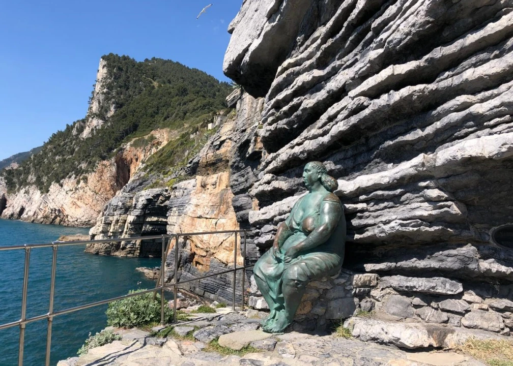 IN THE IDYLLIC TOWN OF Porto Venere sits a peaceful bronze statue that represents Mother Nature. Her position on the rocky crags above Lord Byron’s Grotto gives her a fantastic view of the Gulf of La Spezia. Despite her windy perch, the sculpture appears serene, contemplative, and infinitely patient.