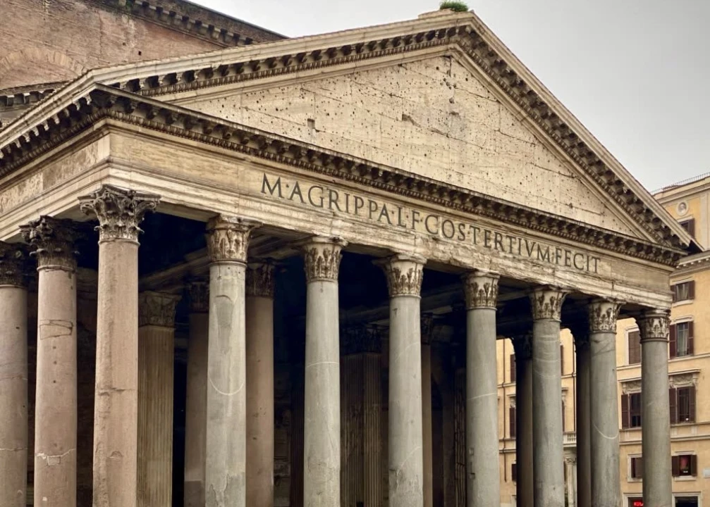 Walking through Rome and suddenly stepping onto Piazza della Rotonda to see the Pantheon in all its ancient glory is an unforgettable experience. First, you will note the domed ceiling, then the columns, and near the top of the Pantheon you will see some old writing.