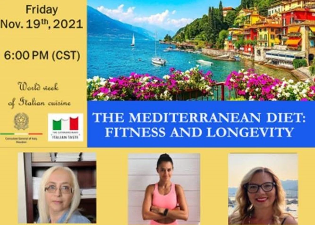 Friday, November 19, 2021 at 6:00 PM CST on zoom. On the occasion of the World Week of the Italian Cuisine in the World join us for webinar "THE MEDITERRANEAN DIET: FITNESS AND LONGEVITY" moderated by Diana Naridello, with the participation of Elena Volpi and Désirée Triolo.