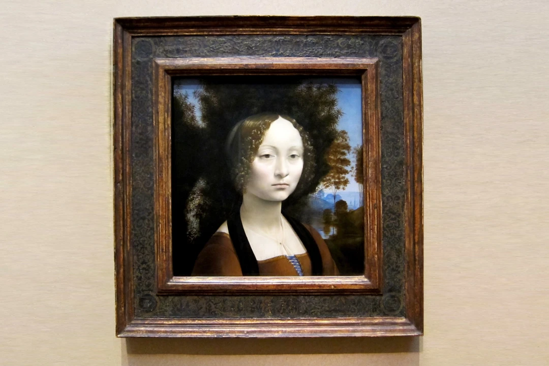 At the time, Leonardo was in his 20s, a young artist on the cusp of a grand career. His subject, meanwhile, was a teenager on the cusp of adulthood. As portrayed by Leonardo, Ginevra boasts smooth bronze curls, a flawless porcelain complexion, an elegant neck and noble bearing. Her eyes are heavily lidded, and her face sports a serious, contemplative expression.