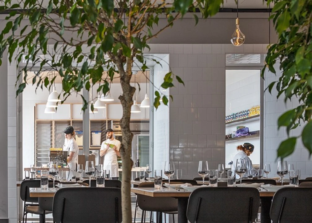 Should you find yourself near Williamsburg’s waterfront on a given afternoon, you might discover an act of theater unfolding on Kent Avenue. Looking through the ground-level windows of the restaurant Misi, chef Missy Robbins’s eatery that opened last fall, you’ll find cooks preparing for the evening’s guests. Specifically, they are making pasta—kneading, extruding, and pressing—in a room that Misi’s designers, Asfour Guzy Architects, tailored specially for the craft.